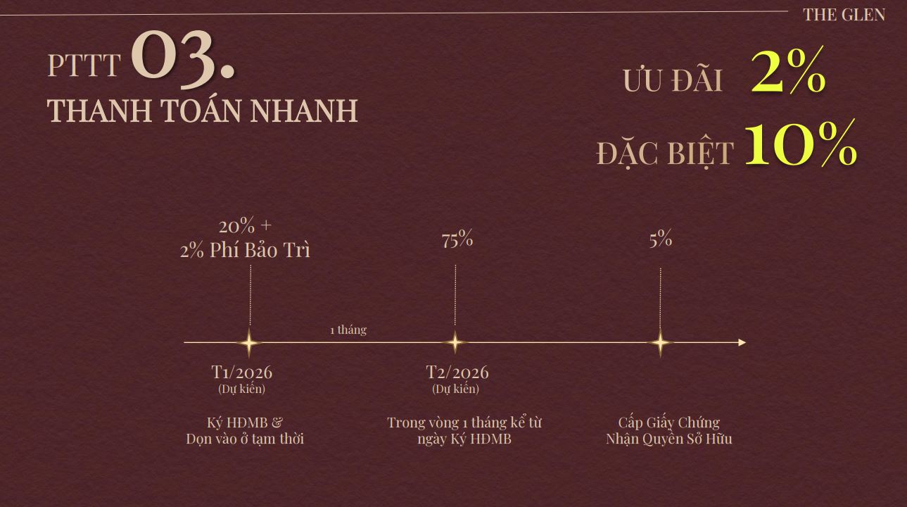 Với số lượng 98 căn giới hạn, The Glen trở thành đặc quyền khan hiếm cho số ít chủ nhân muốn khẳng định vị thế và tận hưởng giá trị sống trường tồn. Đây cũng là minh chứng cho xu hướng bất động sản của giới thượng lưu: không gian sống đẳng cấp, khác biệt và đầy tinh hoa.